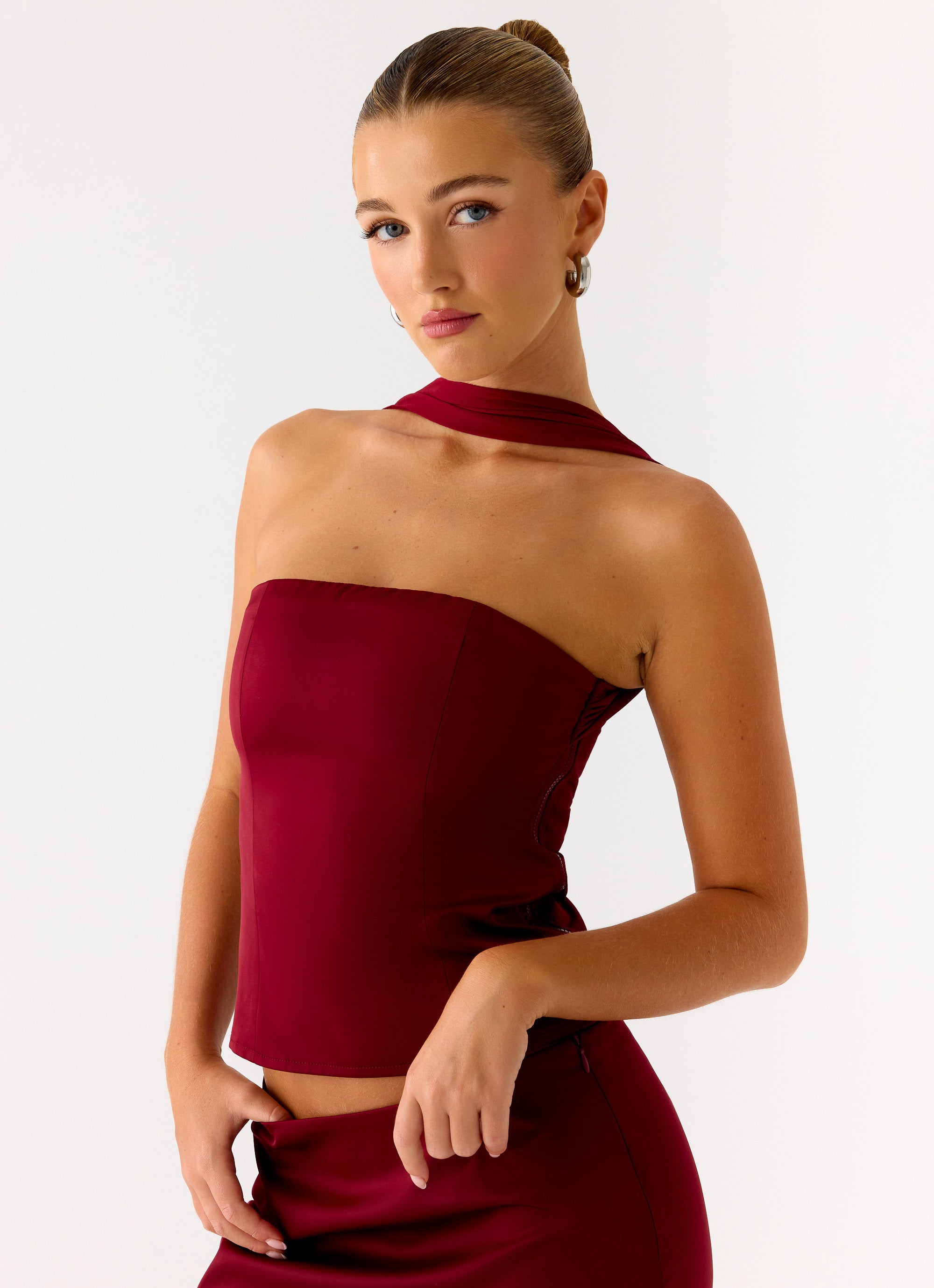 The Do It Again Top is a strapless corset-style piece with scarf detailing, fully lined for comfort and structure, finished with a side invisible zipper.